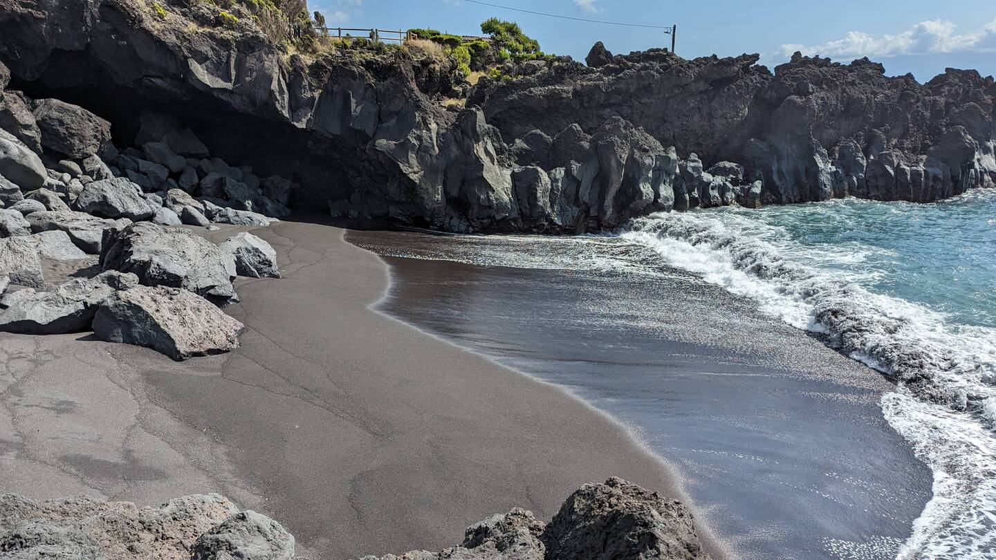 Wir sind gegen 16 Uhr zurück in der Unterkunft. Diese hat nämlich einen weiterer Vorteil der nahe Strand. Besser gesagt eine kleine Bucht mit schwarzem Sand. Zusätzlich hat es noch eine kleine Grotte die ein gezeiten Pool ist und ein kleiner Hafen der natürlich auch zum Schwimmen geeignet ist. Und das alles kaum 5 Minuten zu Fuss entfernt. Wenigstens auf dem Hinweg, zurück sind es dann wohl knapp 10