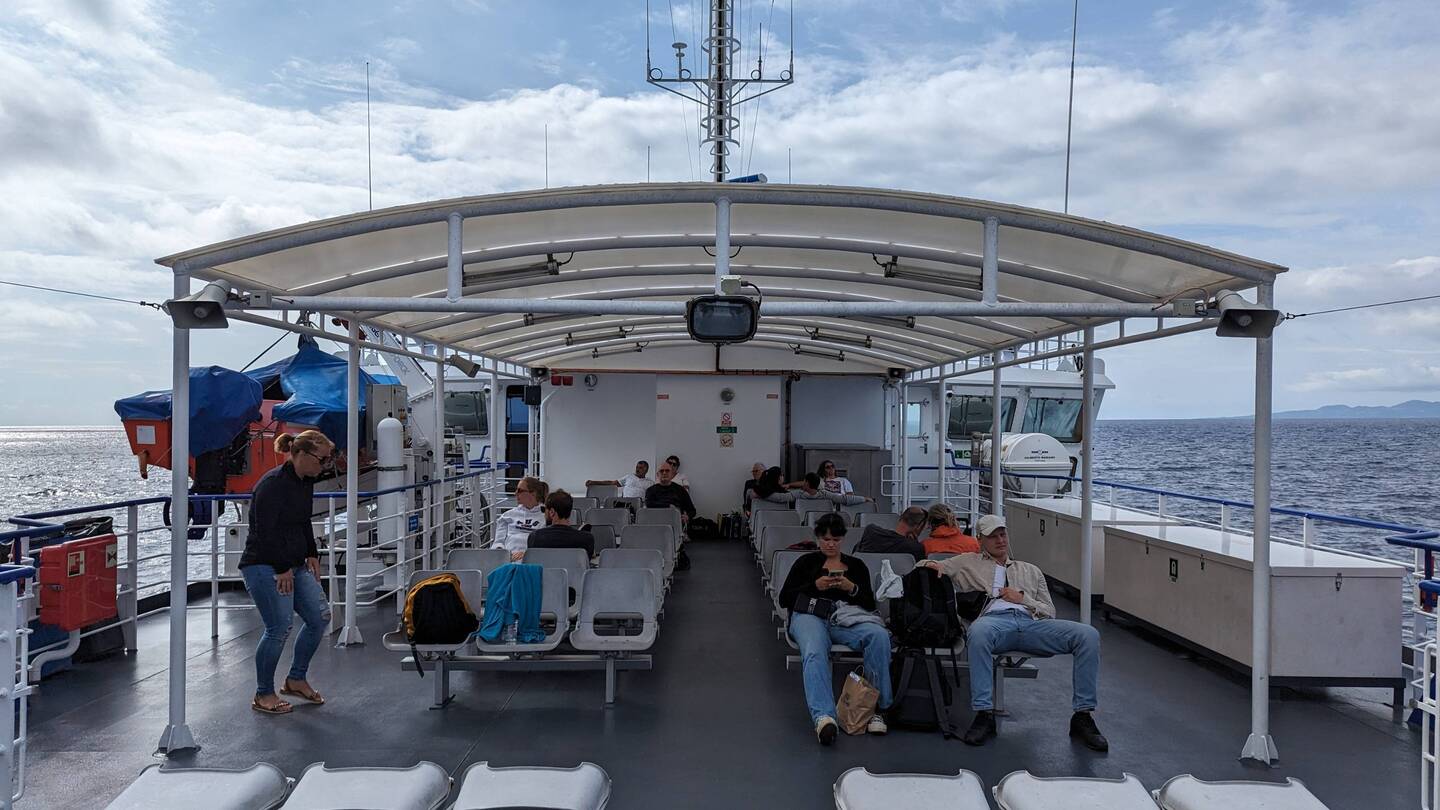 Diesmal sind nur wenige Passagiere an Bord. Wir nehmen unsere Plätze auf dem dritten Deck im Freien ein. Das Meer ist heute ruhig, niemand verteilt Plastiktüten, denn niemand braucht sie. Bei sonnigem Wetter fahren wir entlang der Südküste Richtung Osten und versuchen, an den Hängen der Serra de Topo und an der Küste die verschiedenen Orte wiederzuerkennen, die wir während unseres Aufenthaltes besucht haben.