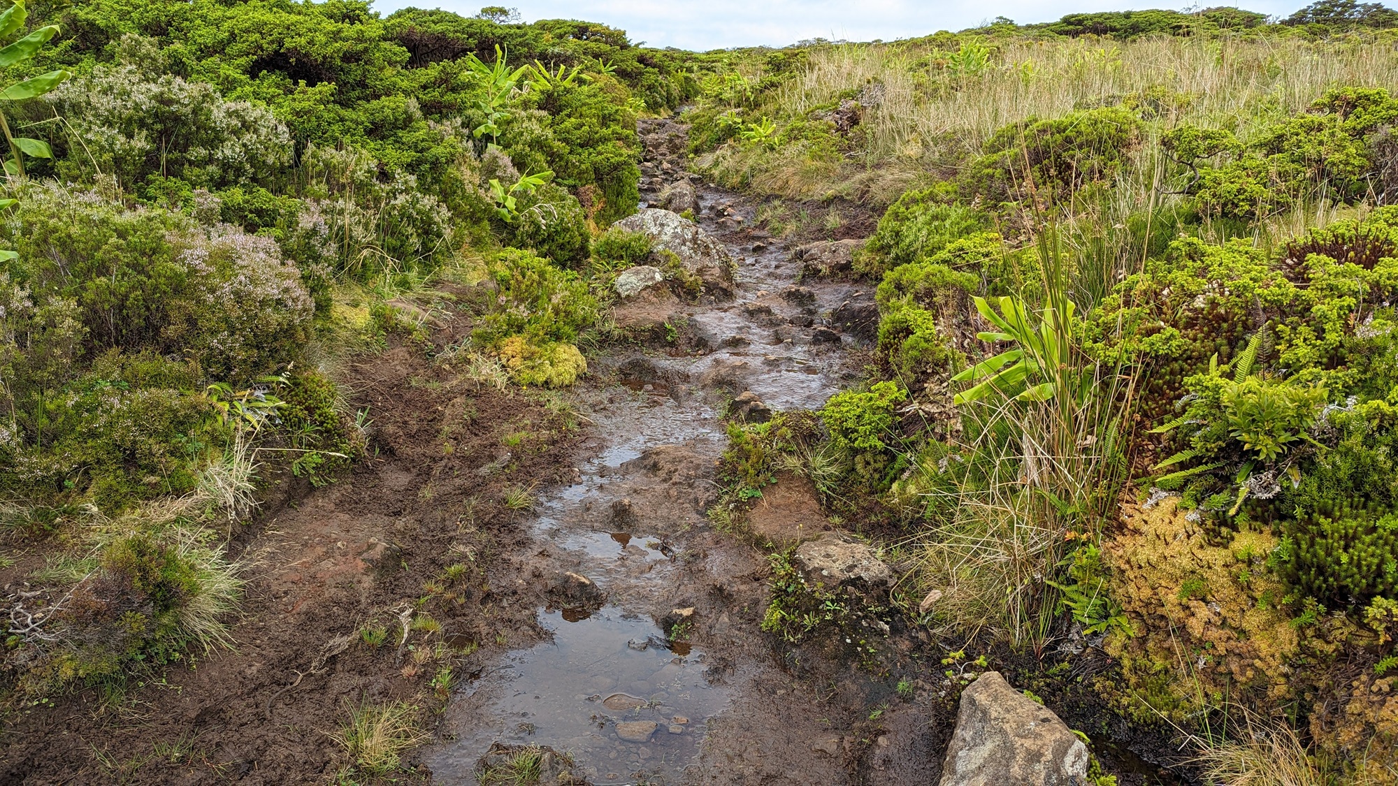Zuerst sehen wir uns den Miradouro Lagoa Negra e Lagoa Comprida an. Der eine See ist tatsächlich schwarz, nur ist das auch der lange (comprida). Aber schön sind sie allemal! Danach starten wir unsere Wanderung von welcher wir hoffen, dass sie auch für Michel machbar sein wird. Und wirklich, Michel schafft die ganze Runde die wir uns vorgenommen hatten. Dies obwohl es im Moor stellenweise ziemlich matschig und glitschig war. Wir geniessen es beide sehr wieder mal am Wandern zu sein. Wir brauchen für die gut 5 km beachtliche 2 ½ Stunden aber dafür haben wir auch Zeit die Schönheit der Umgebung in uns aufzusaugen und auch der Regen-Nebel wandelt sich ziemlich rasch in grau-blau und dann Sonnenschein um.