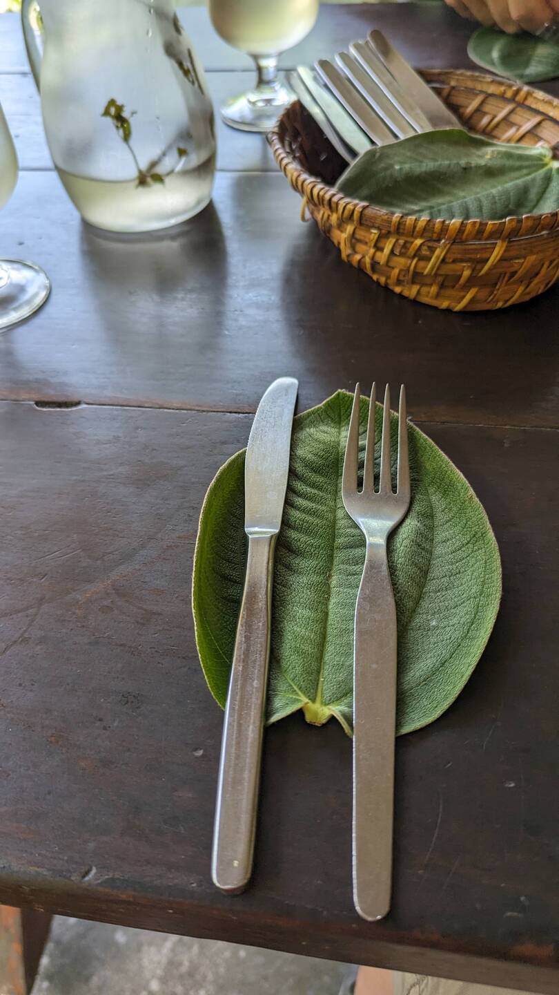 Hans, unser Gastgeber, bringt uns eine Karaffe mit kaltem Kräutertee, das Besteck und zwei schöne Baumblätter als Servietten. Der Ton wird vorgegeben.