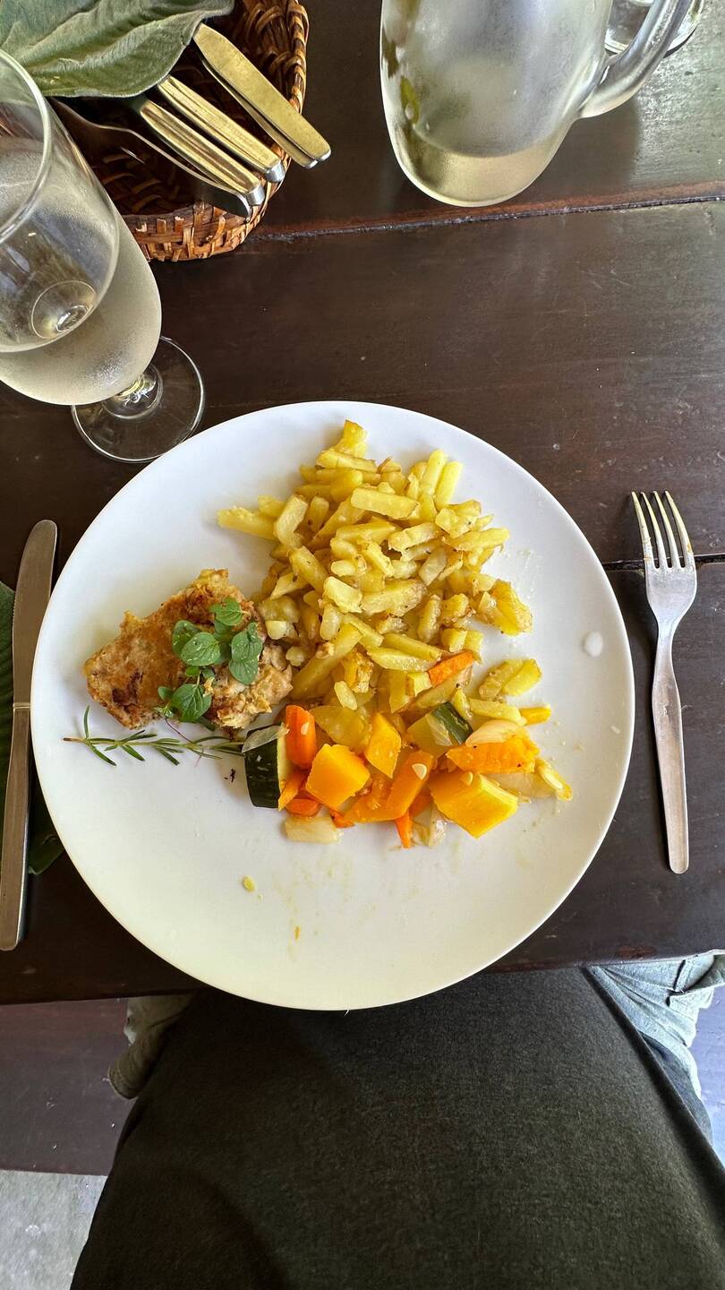 Das Restaurant scheint bei unserer Ankunft geschlossen zu sein. Ein Besen, der quer vor der offenen Tür steht, versperrt den Eingang. Als wir uns auf den Rückweg machen, erscheint ein lächelnder, barfüssiger Mann in den Sechzigern, der uns auf Englisch fragt, wie er uns helfen könne. Nach einem kurzen Wortwechsel erkennt Markus den deutschen Akzent unseres Gesprächspartners, der bestätigt, dass er Deutsch spricht. Es ist der Restaurantbesitzer. Er bietet uns entweder ein 4-Gänge-Überraschungsmenü, einen Salat oder das Hauptgericht an. Wir entscheiden uns für die letzte Variante. Wir nehmen auf der Terrasse über einem Bach Platz.