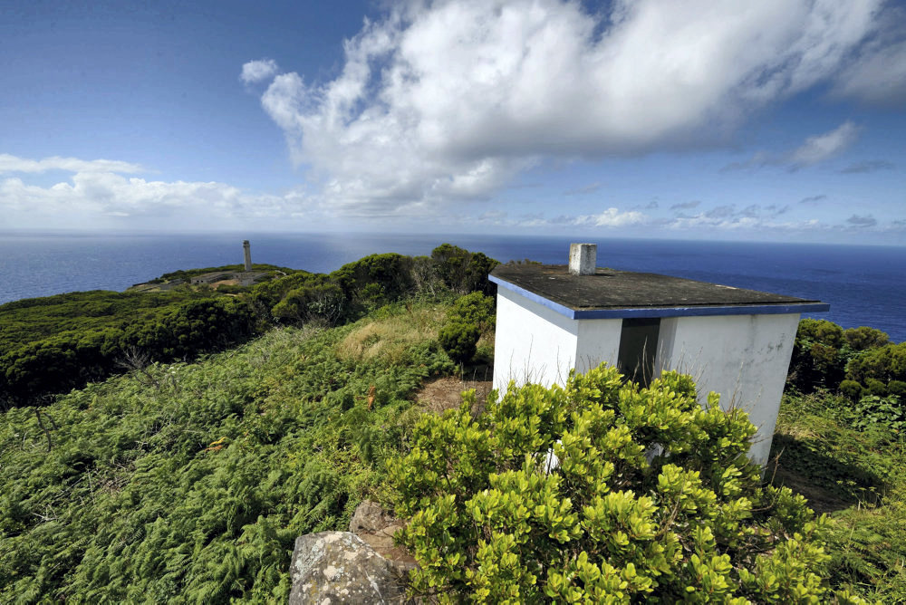 Der alte Walausguck (vigia da baleia da Ponta dos Rosáis) am Leuchtturm im Westen der Insel. Die geflieste Wand, bemalt mit den Walen, befindet sich im Inneren des Ausgucks.