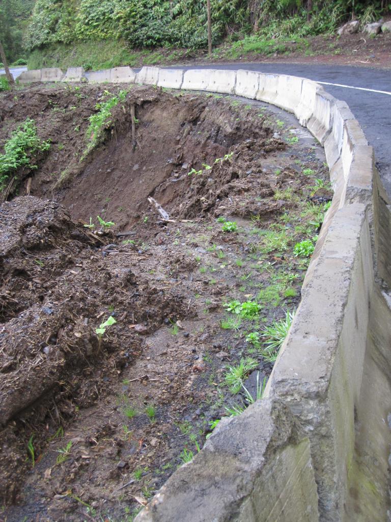 Die starken Regenfälle des vergangenen Winters haben den Azorenstraßen sehr zugesetzt. Sturzbäche und Gerölllawinen überschwemmten die Hangstraßen und führten zu Abschwemmungen und Abbrüchen. Teilweise sind Menschenleben zu beklagen. Vieldutzendfach sehen wir am Straßenrand rotweiße Bändchen oder Straßenpolder. Blicken wir darüber hinweg, schauen wir oft in große, schwindelerregende Tiefen. Die Beseitigung der Schäden ist zeit- und kostenintensiv. Die Straßenverwaltungen sind da überfordert, denn es müssen oft schwere Basaltfelsen zur Absicherung angefahren und hohe Stützmauern errichtet werden. Bitte lieber Tourist, fahre vorsichtig und mit Abstand an solchen Absperrungen vorbei!