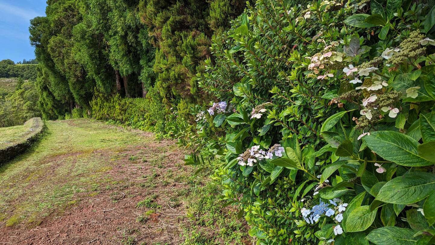 Über eine Strasse, die eigentlich nur aus Schlaglöchern besteht, erreichen wir nach etwa 20 Minuten den Charcos de Pedro Miguel. Dieser Park hat eigentlich nur einen schönen Parkplatz, ansonsten ist es ein Stück Land mit etwas Buschwerk und einem kleinen Aussichtsturm zur Vogelbeobachtung. Wir schlendern trotzdem einmal herum. Für die Azoren wohl schon etwas Besonderes, denn überall stehen Brombeersträucher (leider keine auf den Fotos) und die Luft ist erfüllt vom Pfefferminzgeruch der allgegenwärtigen Pflanzen. Übrigens ist hier unten wieder wunderbares Sommerwetter und der Gedanke an den kalten Kraterrand scheint wie von einer anderen Welt.