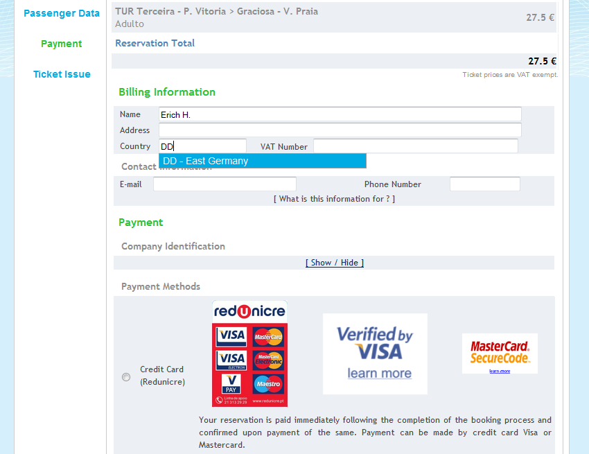 Erst dachte ich, es sei die Atlanticoline. Aber die gibt es ja schon seit neun Jahren. Und zu diesem Zeitpunkt sollte es sich auch bei ihr herumgesprochen haben, dass es eine deutsche Wiedervereinigung gab. Es muss also wohl ein Buchungsportal sein, dass seine Suchmaske schon vor der Wende und vor Einführung des Internets vorsorglich erstellt hat und dann eine Aktualisierung vergessen hat.