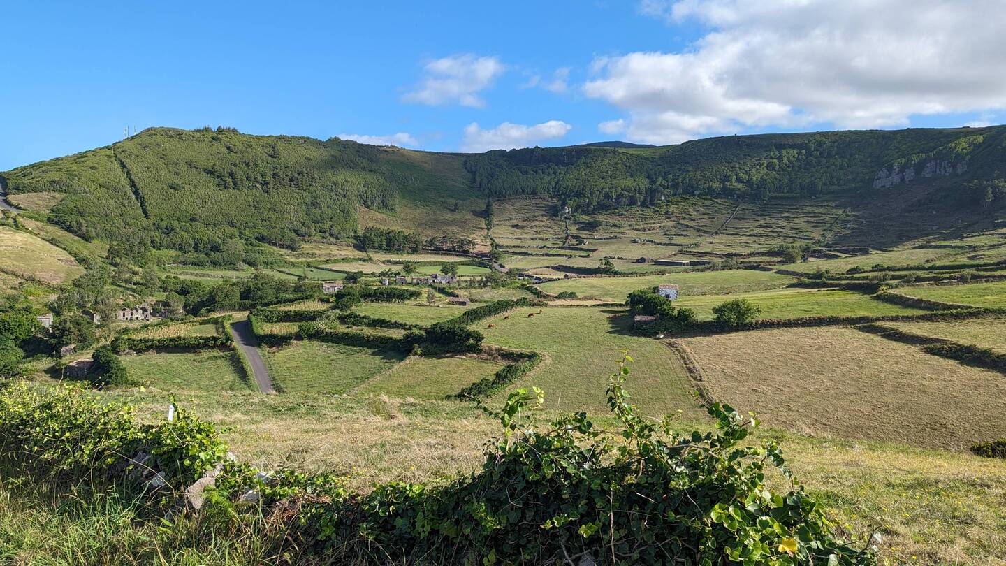 Auf der Fahrt nach Lajes zeigt mir Markus Teile seiner heutigen Wanderung, unter anderem halten wir an einem Miradouro, von dem aus wir die Wasserfälle von heute Nachmittag aus der Ferne sehen können.