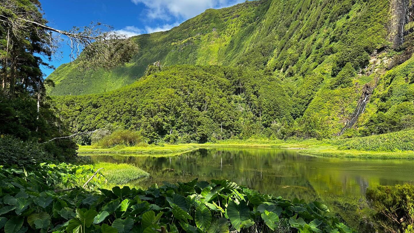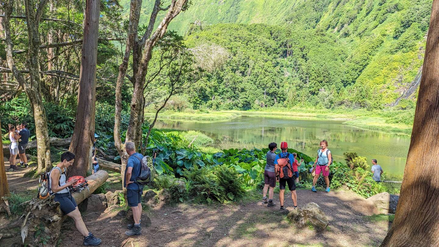 Unser nächstes Ziel, der Poço da Ribeira do Ferreiro, auch bekannt als Alagoinha, liegt nur 4 Kilometer entfernt von unserer Unterkunft. Es ist einer der schönsten Orte auf der Insel und daher ein Muss für einen Besuch. In diesem kleinen Paradies, das von einer üppigen Vegetation umgeben ist, gibt es eine kleine Lagune, die an eine bewaldete Klippe grenzt und von mehreren Wasserfällen gespeist wird. Ein kurzer, steiler und steiniger Weg führt dorthin.