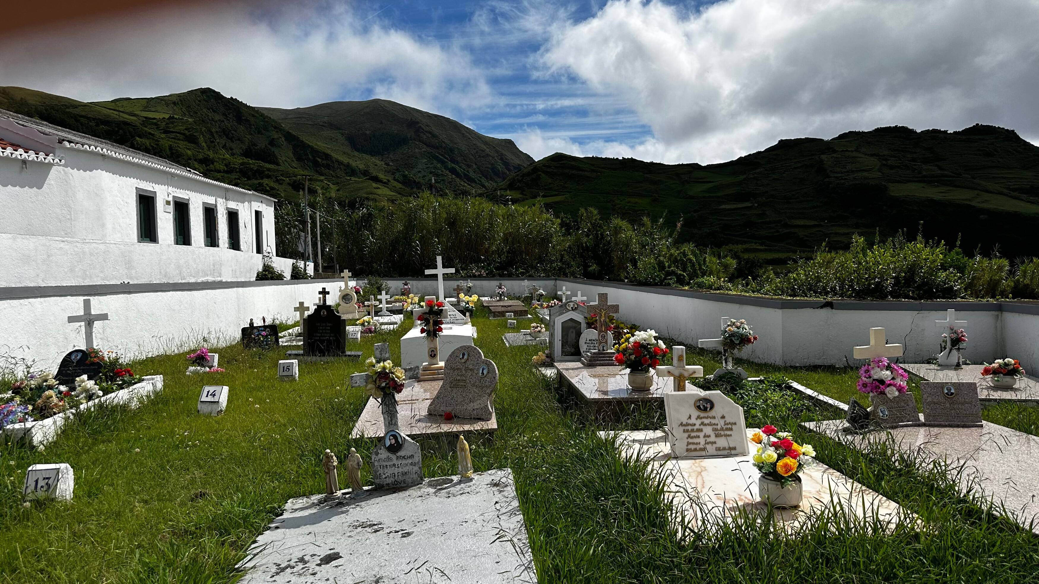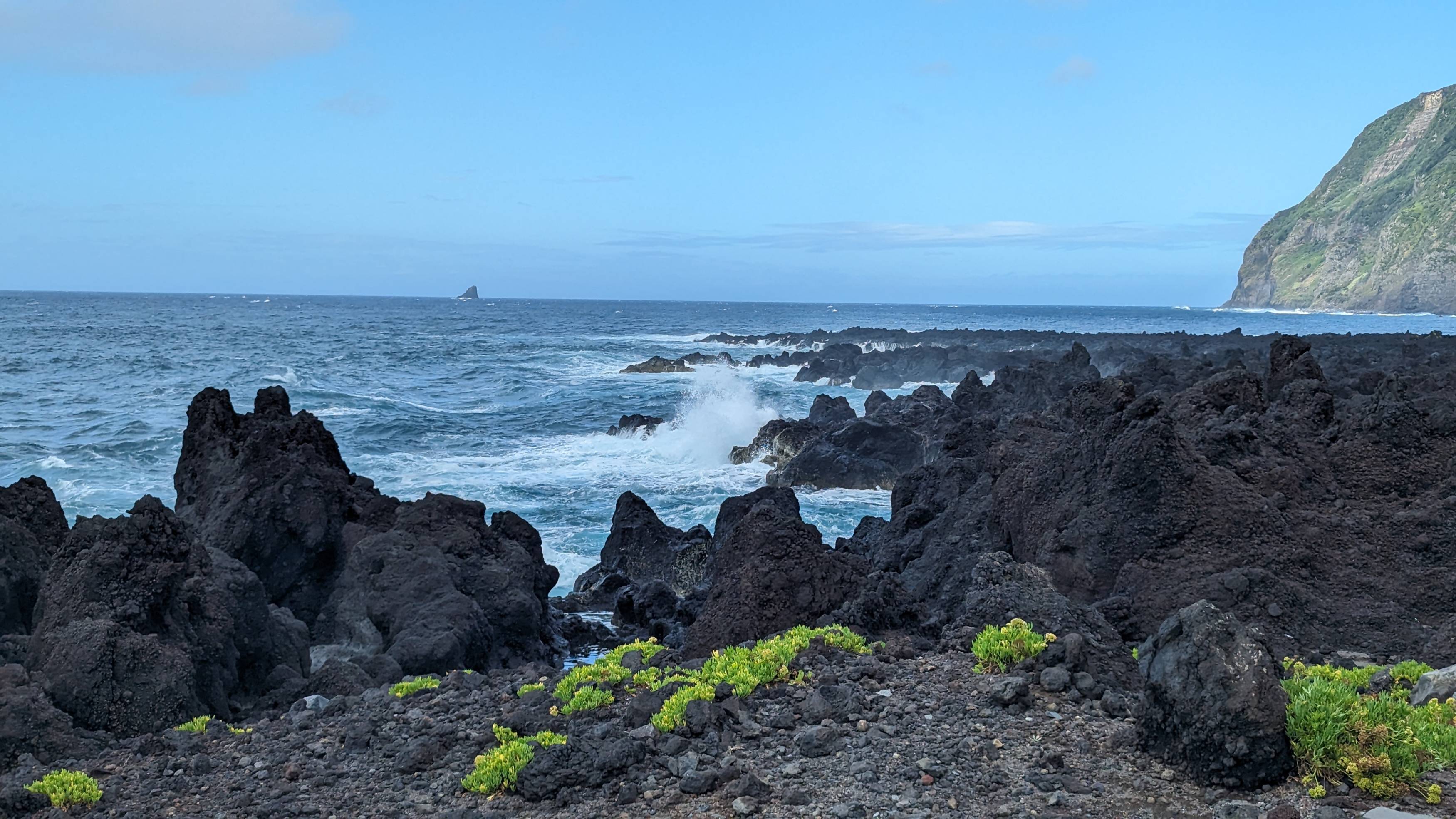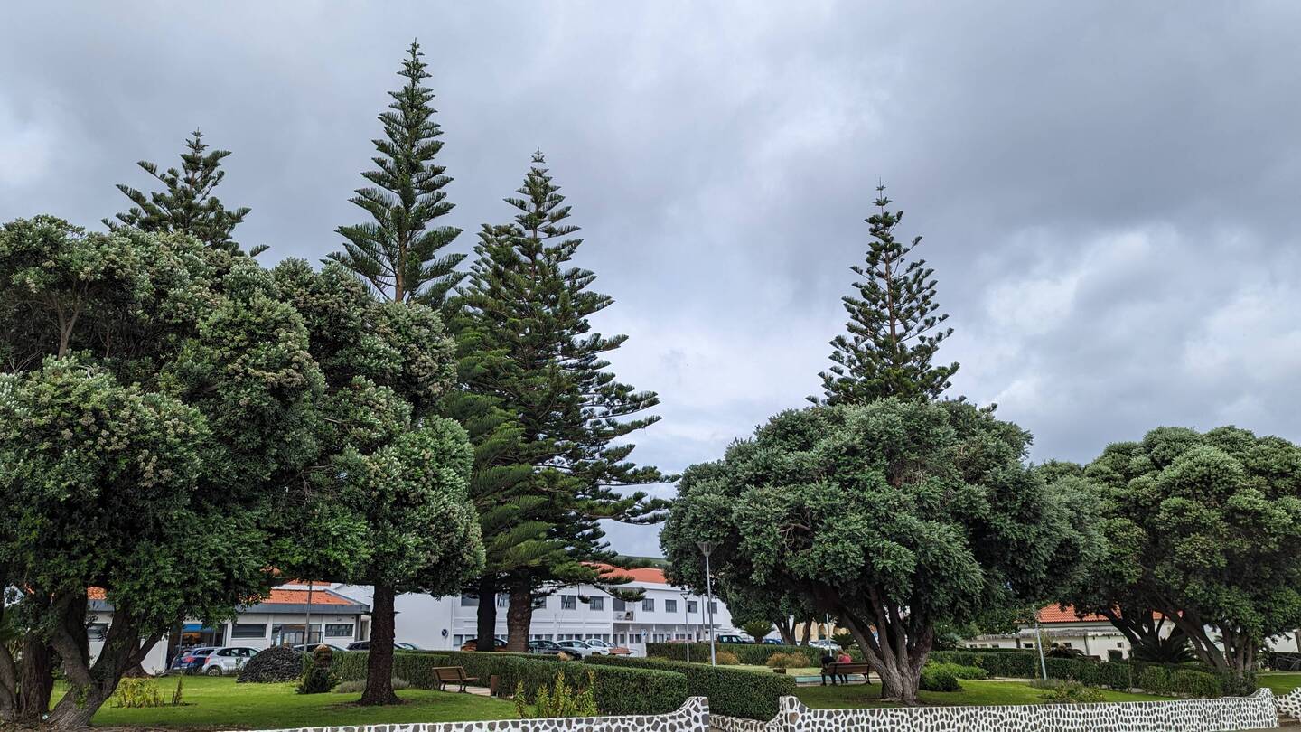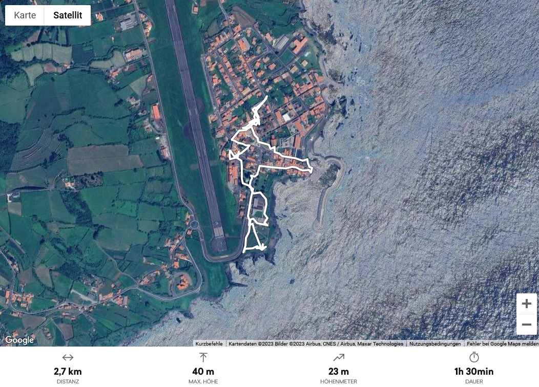 Nun schauen wir uns das Städtchen an. Von den ca. 3900 Einwohnern der Insel leben 1750 im Hauptort. Also mehr als jeder 3. Bewohner von Flores. Wir schauen uns die Kirche an, schlendern zum Hafen, kommen an 3 Restaurants vorbei und trinken in dem Café wo sich anscheinend der Ort trifft einen Pingado (Espresso mit etwas Milch) und nehmen auch gleich die 2 Schokogipfel/Pain au Chocolat die es dort noch in der Vitrine gibt. Wo die herkommen ist uns ein Rätsel, denn laut Google gibt es auf der Insel keine Bäckerei. Aber die Insulaner wissen es wahrscheinlich besser als das Internet.