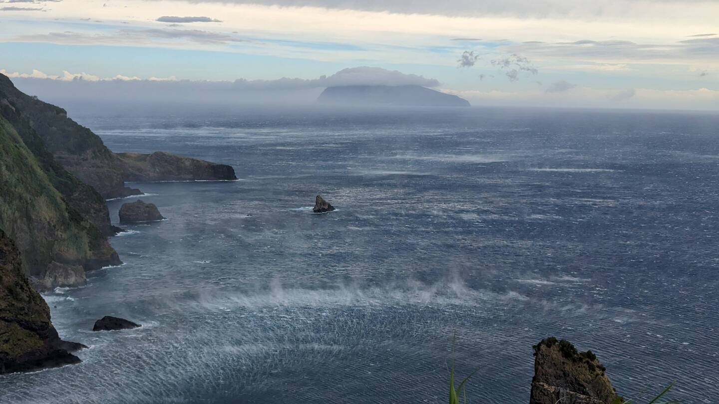 Der Wind peitscht das Wasser, im Hintergrund die Insel Corvo