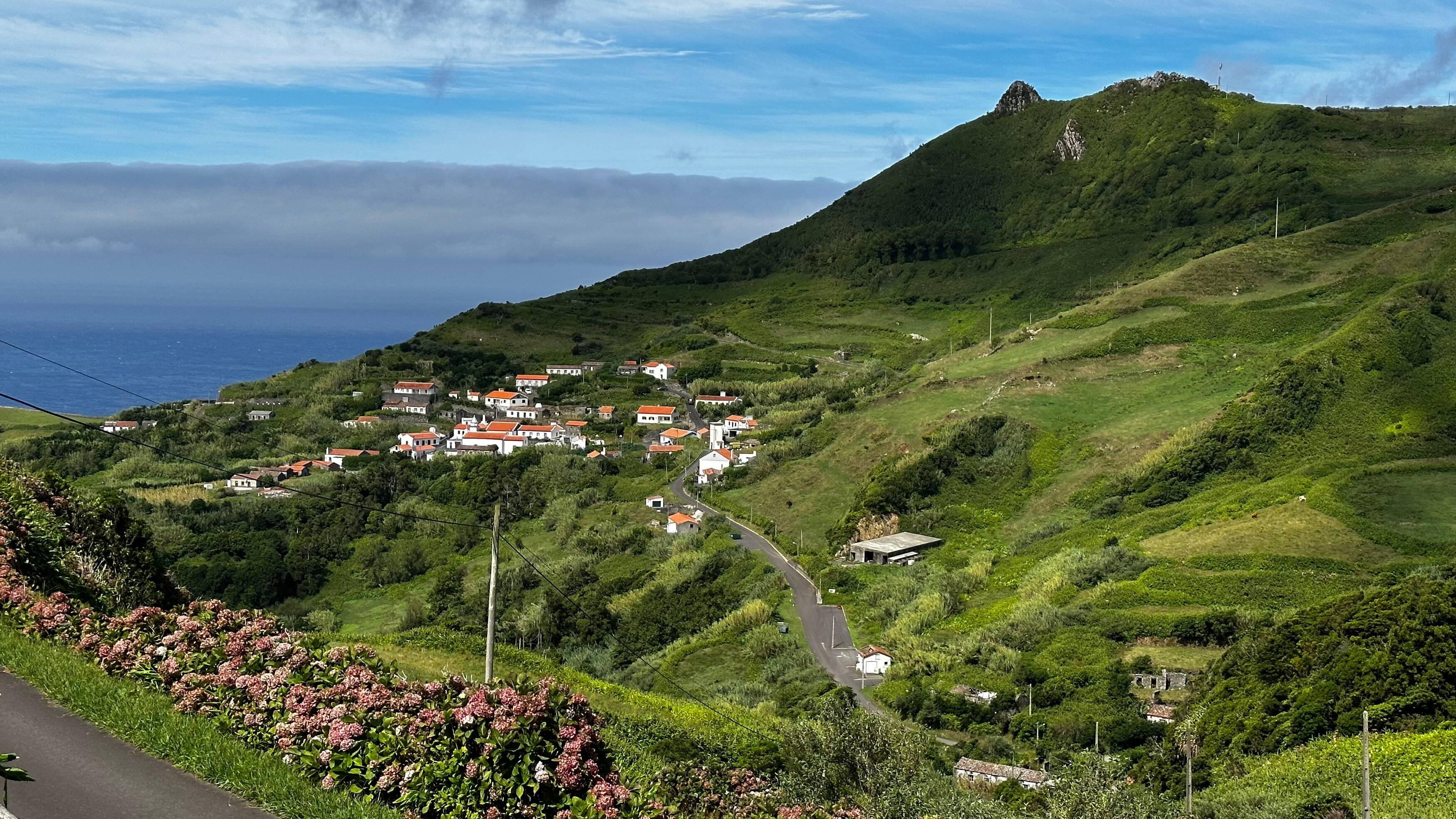 Regentag, zumindest teilweise. So bleiben wir etwas länger liegen und frühstücken gemütlich. Währenddessen zeigen sich die ersten blauen Fetzen am sonst dunkelgrauen Himmel. Eigentlich wollen wir am Nachmittag nach Santa Cruz das Flores fahren, um im SATA-Büro noch einmal wegen unseres Fluges am Samstag nachzufragen. Wir konsultieren die Windy-App, das wohl zuverlässigste Wetterprogramm für hier und es scheint tatsächlich für die nächsten Stunden regenfrei zu bleiben. Schnell das Geschirr gespült, Regenjacke, Schirm und was man sonst noch so für einen Stadtbummel braucht eingepackt und ab geht es mit unserem kleinen Auto von der Westküste an die Ostküste. Bald sind wir in dichtem Nebel und es regnet wieder. Doch kaum haben wir das Hochland erreicht, lichtet sich der Nebel, der Regen hört auf und wir haben zumindest teilweise blauen Himmel.