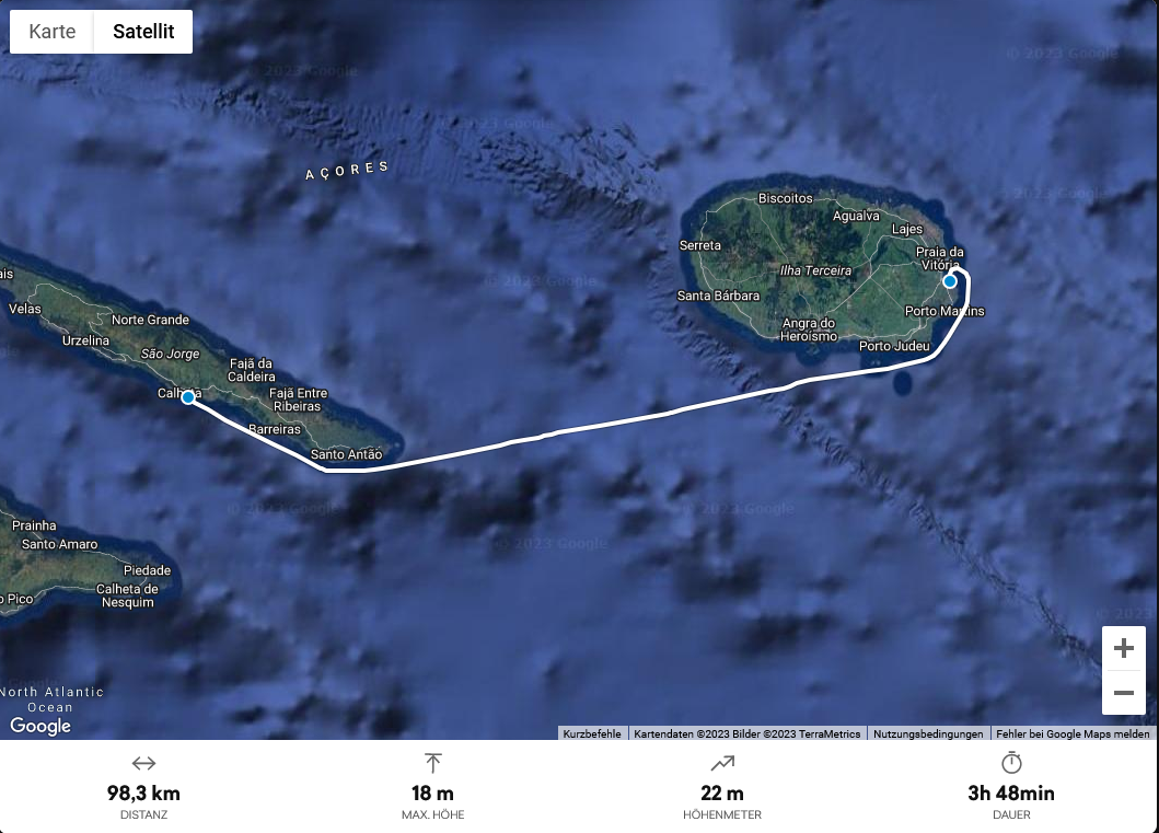 Wir fahren nach Calheta, einem anderen Fährhafen als bei unserer Ankunft, um die Fähre nach Praia da Vitória zu nehmen. Sie soll um 10.30 Uhr ablegen und 3 Stunden und 50 Minuten später wieder auf der Insel Terceira anlegen.