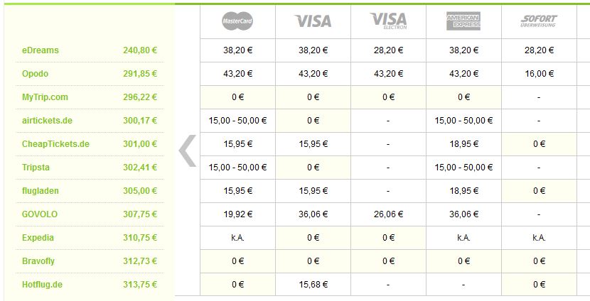 Die Übersicht, was einzelne Reisebüros für den Bezahlvorgang verlangen, erscheint mir doch interessant. Ich habe sie auf der Seite http://www.flugvergleichsportal.com/ kopiert. Der günstigste Fluganbieter muss also keineswegs auch der preiswerteste sein.