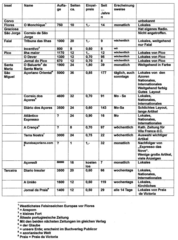 Die Azoren haben überraschenderweise einer sehr lange Zeitungstradition. So wurde die größte Azorenzeitung von São Miguel, der Açoriano Oriental, bereits vor 180 Jahren gegründet. Doch bedingt durch die geringe Einwohnerzahl blieb ihre Auflage stets äußerst bescheiden. Die obige Zeitung hat z.B. derzeit eine Auflage von 4.500 Exemplaren; innerhalb eines Jahres ist sie um 500 Exemplare gesunken.. Die zweitgrößte, der Correio dos Açores, 500 weniger. Beide liegen in ihrer Qualität etwa gleichauf. Was aber irritiert: Der Açoriano Oriental ist zwar im Format kleiner und hat in der Regel einen geringeren Seitenumfang, ist dafür aber 25 ct. teurer.